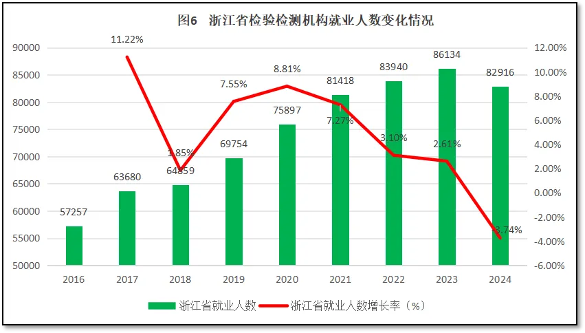 过去9年浙江省检验检测行业就业人口的变化情况如图6所示。由图6可见,从2016年到2023年,浙江省检验检测机就业人口数量从5.7万多人增长到8.6万多人,年均增速6.06%,每年均有一定数量的增长。但2024年出现了就业人口数量的下降,人数为82916人,较2023年净减少了约3000人,这也是浙江省检验检测行业就业人数首次出现下降的情况。从就业人口同比增长率来看,2018年,浙江省检验检测机构就业人口数量增长率曾出现一个低谷,之后几年有所回升。从2021年起又开始下降,2024年度的同比增幅跌到负值,仅有-3.74%,是历年来的最低值。