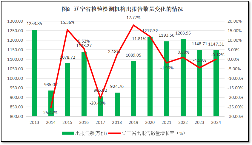 过去12年辽宁省检验检测机构对外出具检验检测报告的数量如图8所示。